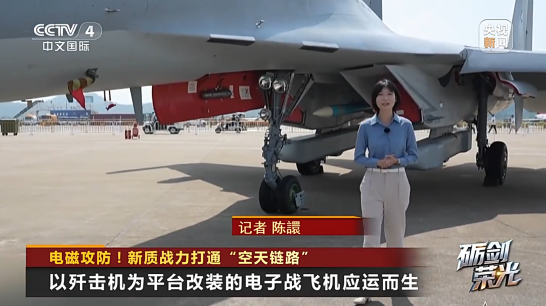 记者庄晓莹:可以看到(歼-15D)采用的是三面、不同功能的选挂吊舱,作战目标多、翼下和翼尖都挂有吊舱。